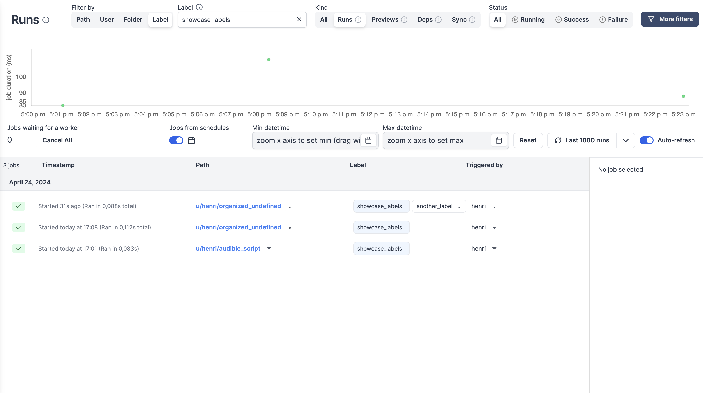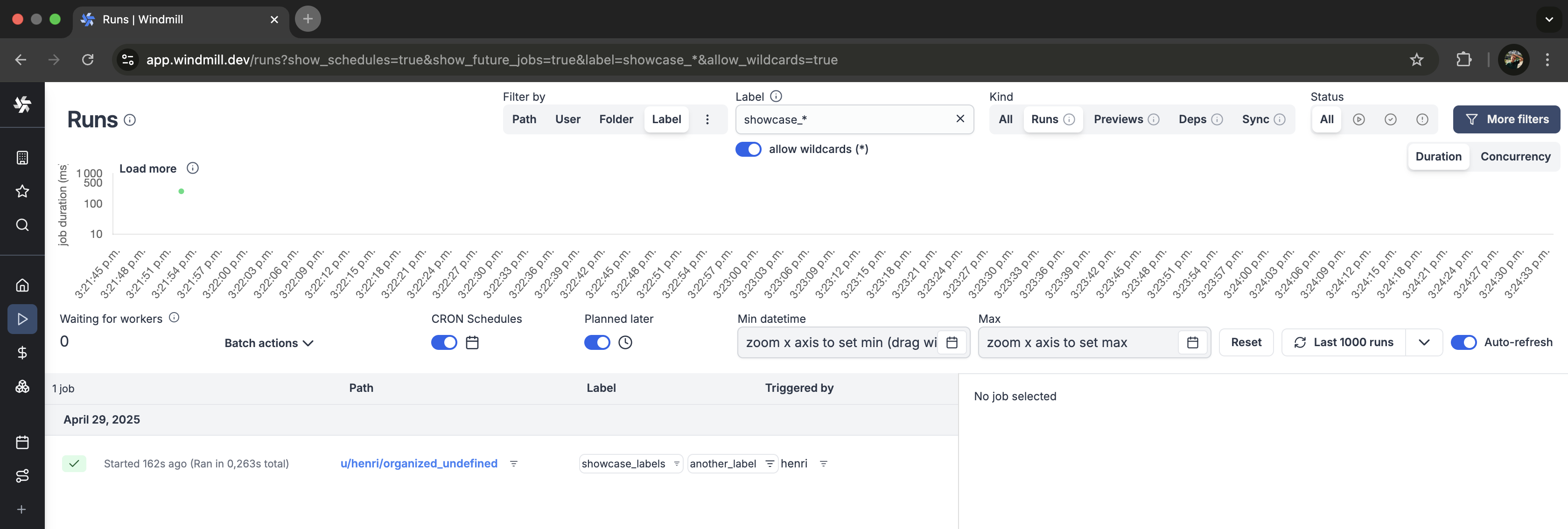 Labels allow to add static or dynamic tags to jobs with property "wm_labels" followed by an array of strings (e.g. return {"wm_labels":["showcase_labels", "another_label"]}