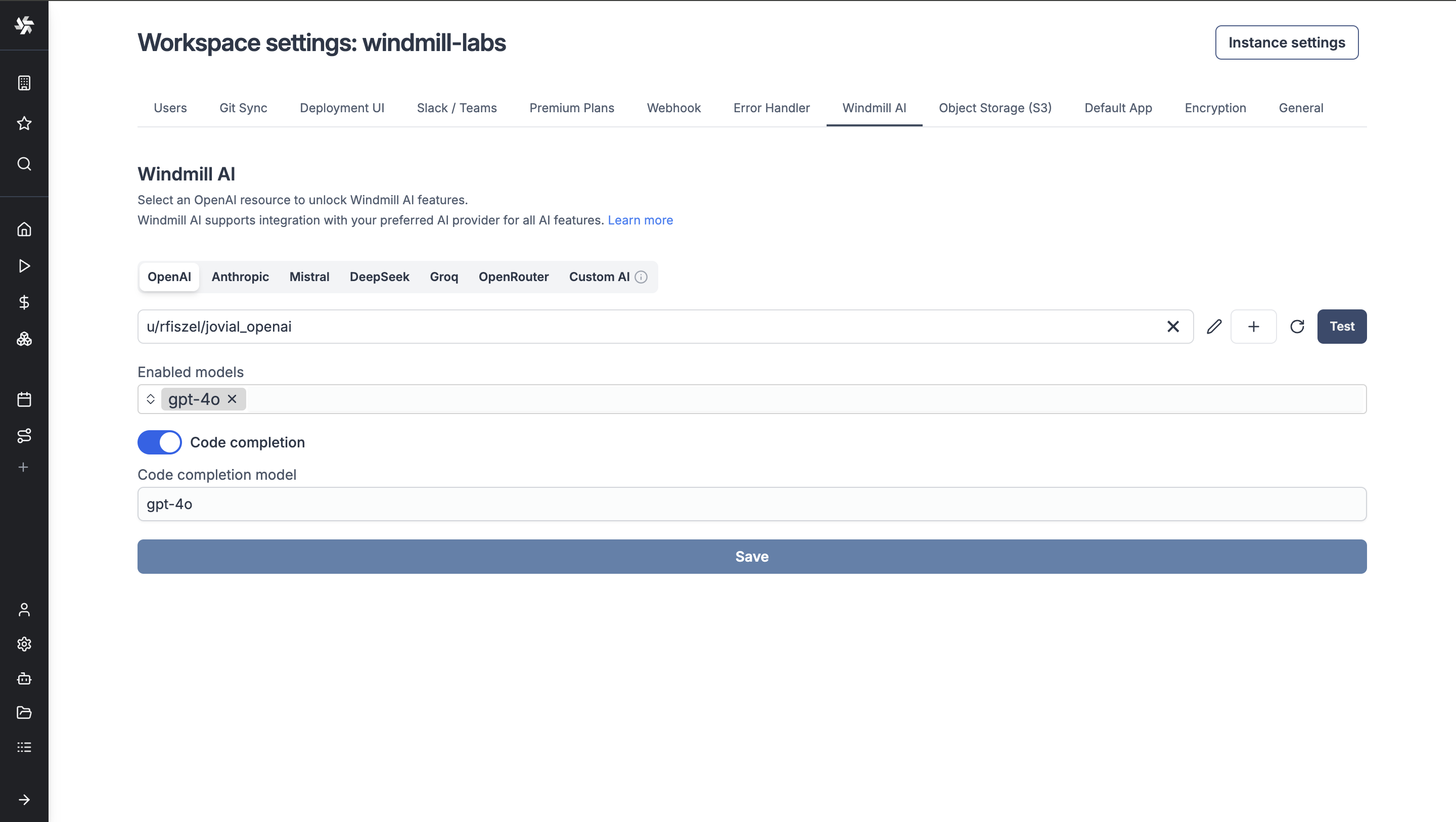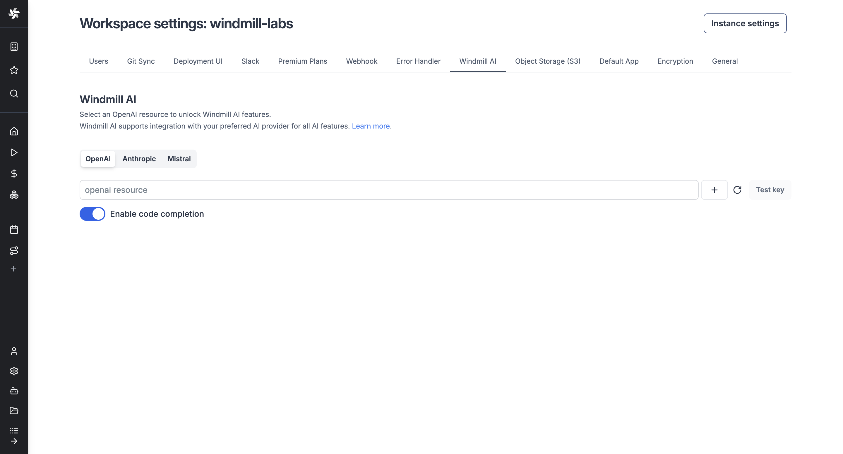 The AI Chat panel now supports API mode, allowing direct interaction with Windmill resources through conversational commands. Access jobs, scripts, flows, resources, variables, schedules, and workers using natural language queries.